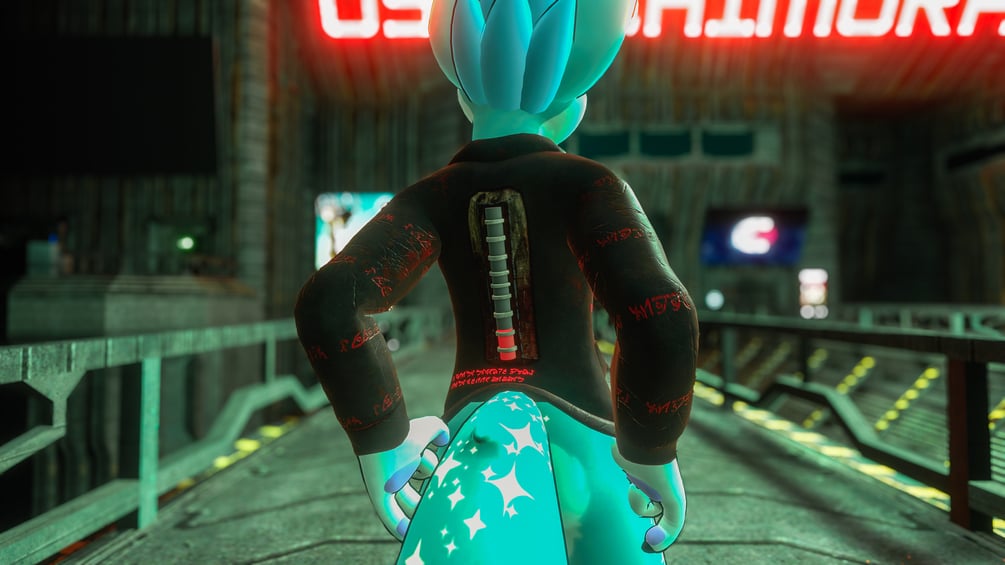 The Pupper Rig Jacket is a VRChat avatar asset inspired by the Dead Space franchise. This asset provides your ScoutArtz Pupper with a cool-looking leather jacket and a spine-mounted display to track your device batteries.